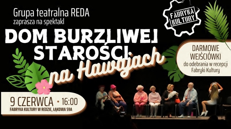 9 czerwca w redzkiej Fabryce Kultury zgodnie z obietnicą, po cieszącym się dużym powodzeniem spektaklu Dom Burzliwej Starości w obsadzie aktorskiej „Grupy Teatralnej Reda” odbyła się premiera sztuki Dom Burzliwej Starości na Hawajach. Ze względu na bardzo duże zainteresowanie przy pełnej sali, odbyły się dwa spektakle, przybyli nie tylko mieszkańcy Redy ale także m. in. słuchacze Uniwersytetu Trzeciego Wieku z Gdyni, Kosakowa i Wejherowa. Grupa międzypokoleniowa działająca pod patronatem Fabryki Kultury zaprosiła na spektakl będący drugą częścią Domu Burzliwej Starości. Jest blisko wakacji, a więc milionerka Alicja zaprosiła wszystkich pensjonariuszy Domu Burzliwej Starości na wakacje i to do swojego hotelu na Hawajach. Po pierwszym spektaklu była miła uroczystość, laudację przeczytała Barbara Bałka, pełnomocniczka do spraw senioralnych Urzędu Marszałkowskiego a Iwona Mielewczyk – Radna Sejmiku Województwa Pomorskiego wręczyła Piotrowi Biedroniowi nagrodę Marszałka Województwa Pomorskiego „Pomorskie dla Seniorów” w kategorii Przyjaciel Seniorów w powiecie wejherowskim. Warto zaznaczyć że aktor „Teatru Wybrzeże”, reżyser współpracujący od sześciu lat z zespołami Fabryki Kultury w Redzie w bieżącym roku otrzymał indywidualne: nagrodę Teatralną Marszałka Woj. Pomorskiego, nagrodę Teatralną Miasta Gdańska, nagrodę aktorską 64Kaliskich Spotkań Teatralnych – Festiwalu Sztuki Aktorskiej, nagrodę aktorską na 48 Opolskich Konfrontacjach Teatralnych. Po drugim przedstawieniu podziękowania twórcom spektaklu złożyli Przewodniczący Rady Miasta Redy Łukasz Kamiński, zastępca Burmistrza Dominika Kudlińska, Sekretarz Miasta Redy Hanna Janiak, były też kwiaty od publiczności. Twórcy spektaklu „Dom Burzliwej Starości na Hawajach”:reżyseria:Piotr Biedroń; scenariusz: grupa napisała sama przy współpracy z reżyserem; scenografia, kostiumy: grupa aktorów amatorów i Fabryka Kultury; Alicja Bubnowska – Alicja Pieniążek – milionerka; Anna Mostek – Angela Kowalsky – aktorka; Beata Morawska – Cezaria Lex – prawniczka; Danuta Dumitrescu Malec – Waluś – playboy, kulturysta; Genowefa Kohnke – Niusia – pensjonariuszka; Hanna Bieszke – Bochnia – dr Ewa Zielińska – lekarka; Izabela Lubelska – Apolonia – śpiewaczka; Jadwiga Weber – Pelagia Zaradna – kandydatka na dyrektorkę; Jan Kohnke – Hipolit – mąż Alicji; Katarzyna Lenda -Krause -Justin – pielęgniarka; Krystyna Lubner- Krystyna Interes Porażka – kandydatka na dyrektorkę; Lidia Wojnarowska – Frania- gość hotelowy; Maryla Piaskowska – Mariolka Kabel – pensjonariuszka, donosicielka; Renata Albecka- Felicity – przewodniczka turystyczna; Teresa Łukaszewska -Żaneta – instruktorka fitness; Piotr Mostek – oprawa muzyczna; technicy sceny – Adam Wysocki; Adrian Stromski; Sebastian Zelkowski.