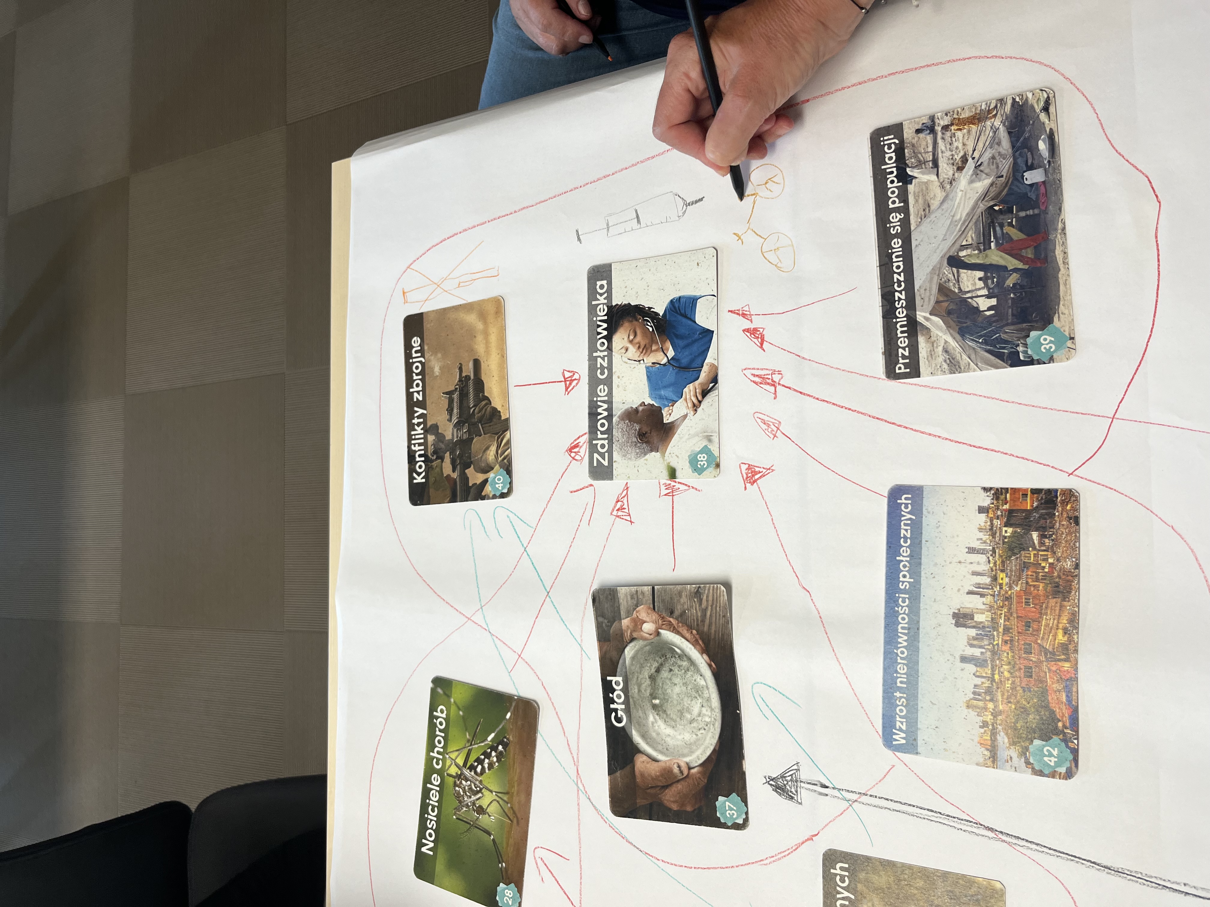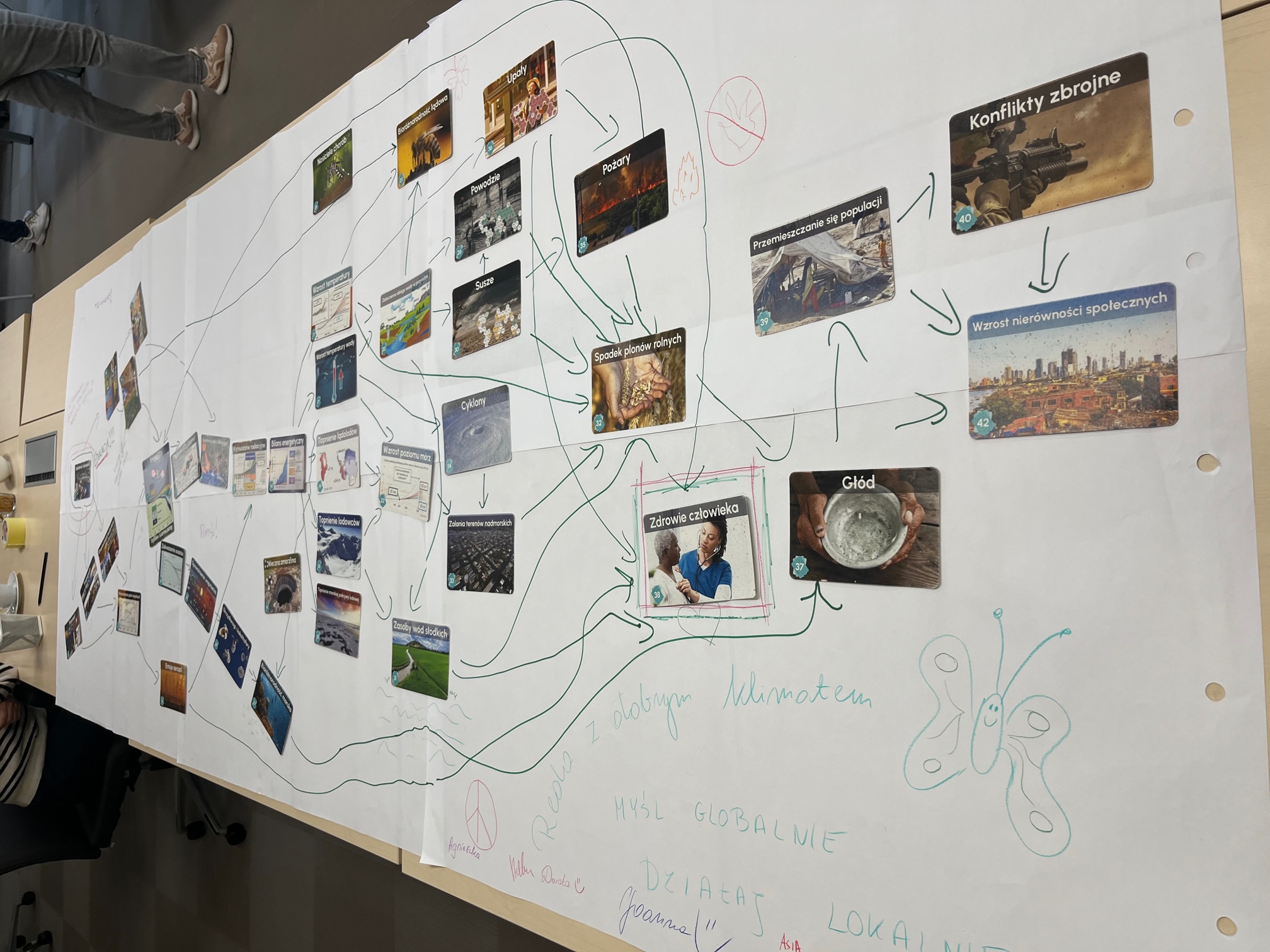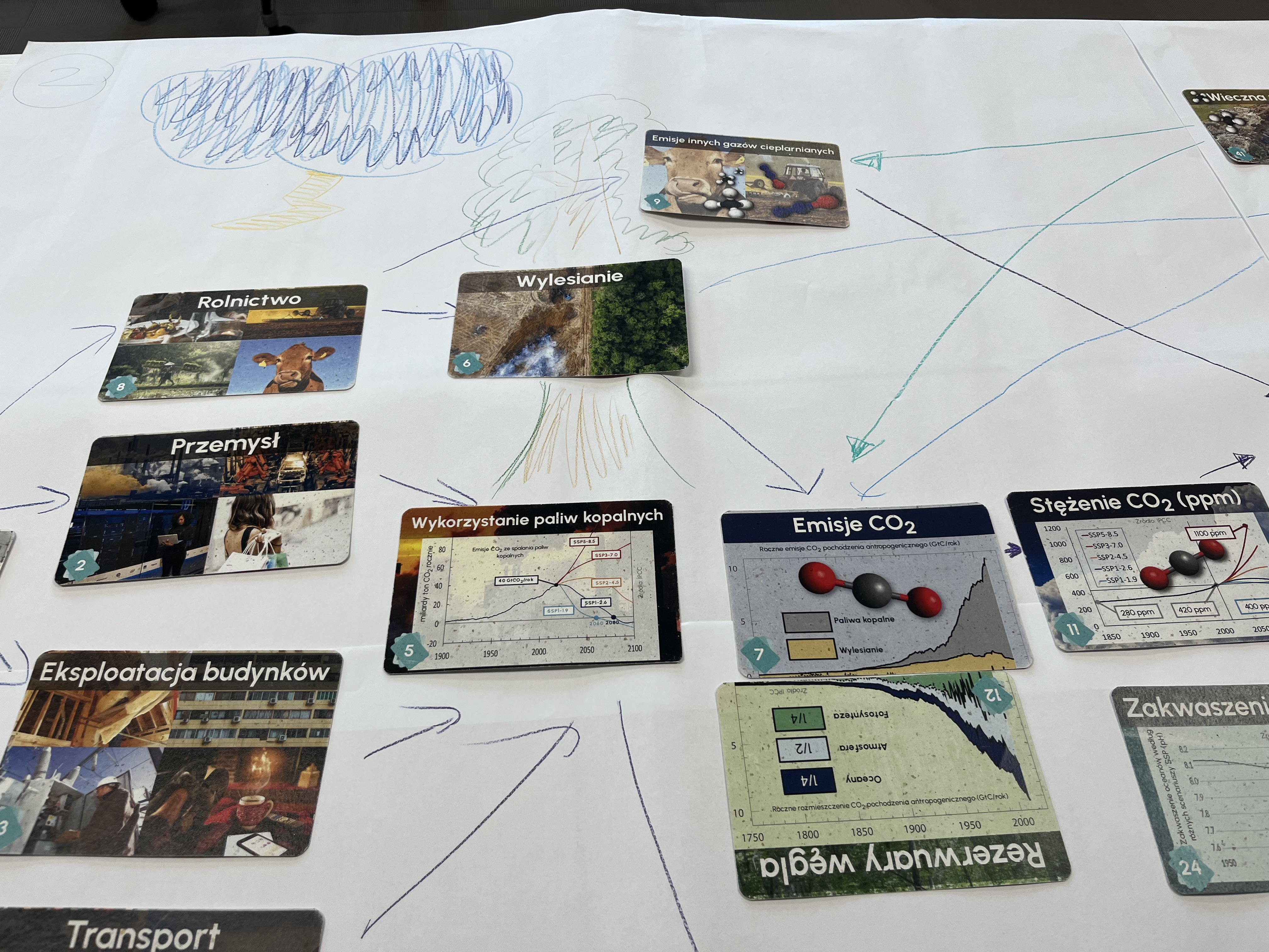 Podczas warsztatu uczestnicy, na podstawie kilku zestawów kart przedstawiających elementy z zakresu nauki o klimacie, wspólnie dyskutowali nad związkami przyczynowo-skutkowymi pomiędzy kartami i tworzyli rodzaj mozaiki ilustrujący różnorodne zależności.