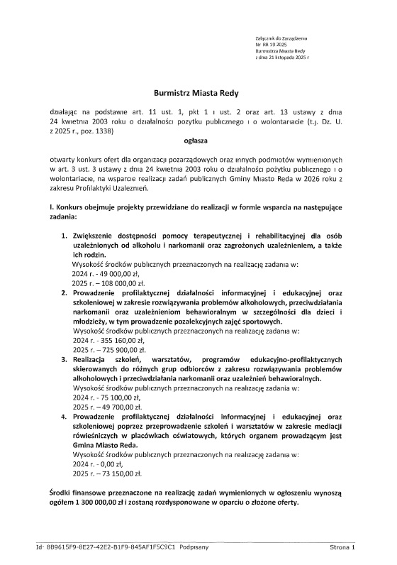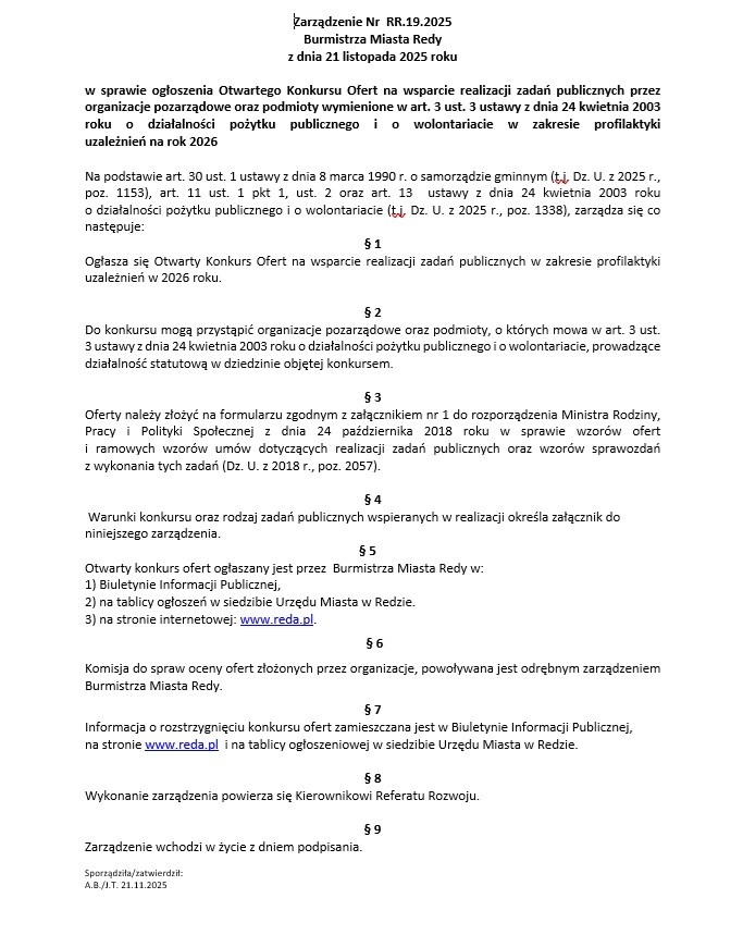 Zarządzenie Burmistrza Miasta Redy Nr RR.1.2026 z dnia 8 stycznia 2026 r.