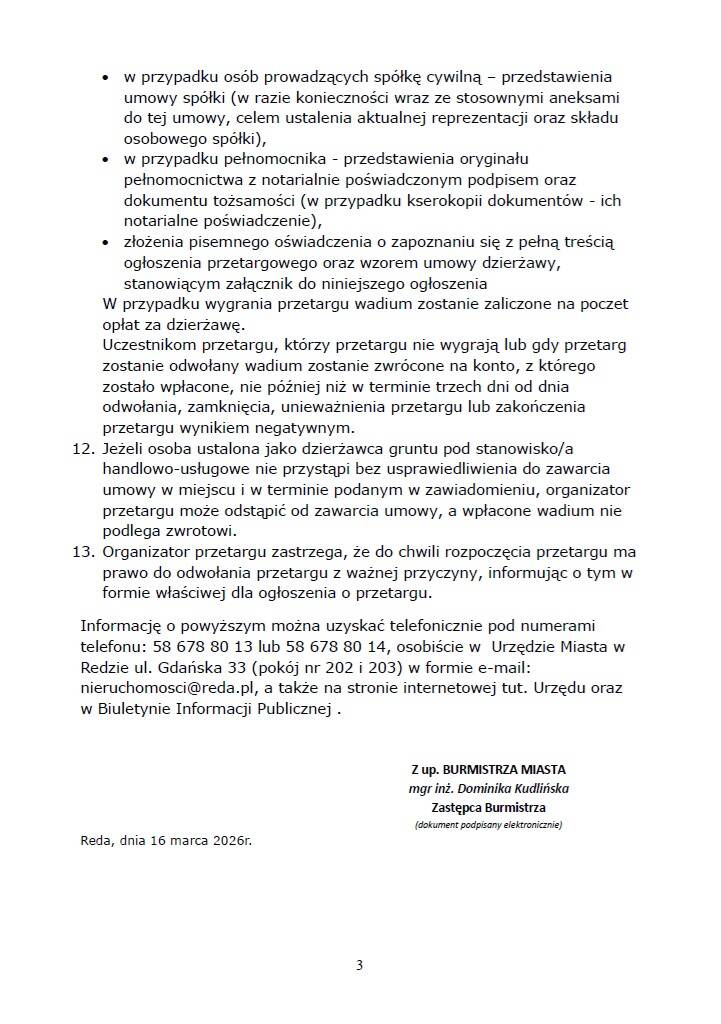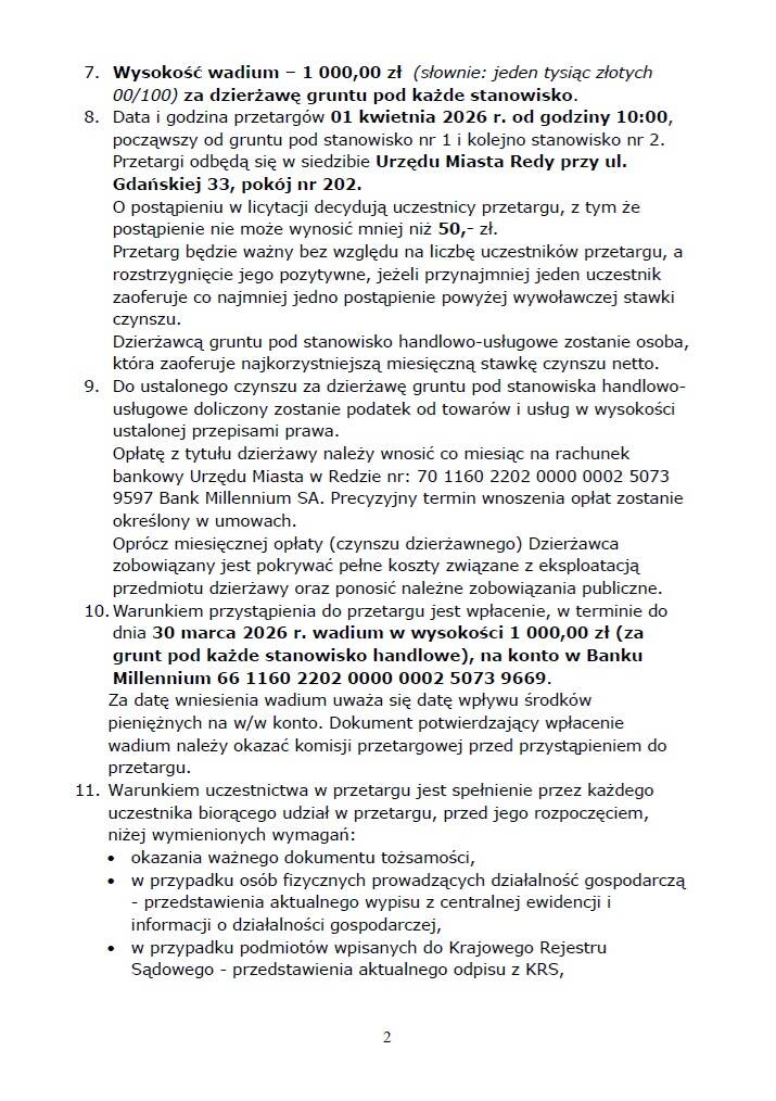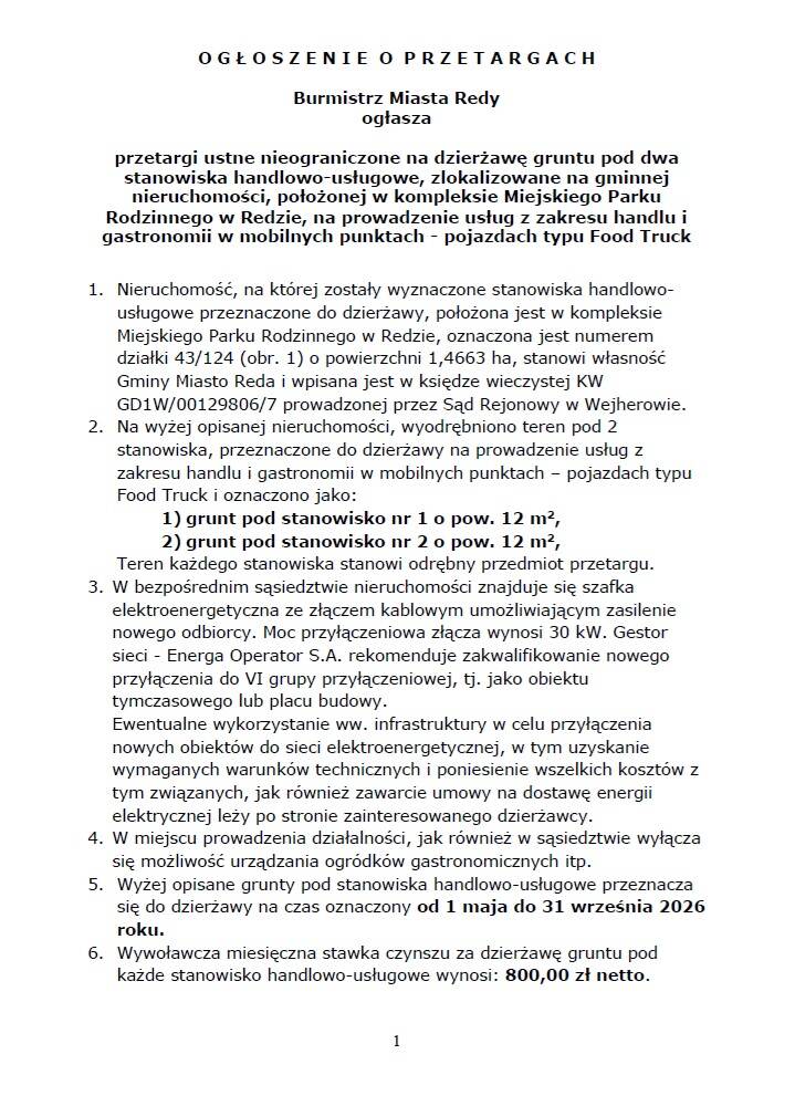 Przetarg ustny nieograniczony na dzierżawę gruntu pod dwa stanowiska handlowo-usługowe, zlokalizowane na gminnej nieruchomości, położonej w kompleksie Miejskiego Parku Rodzinnego w Redzie, na prowadzenie usług z zakresu handlu i gastronomii w mobilnych punktach – pojazdach typu Food Truck