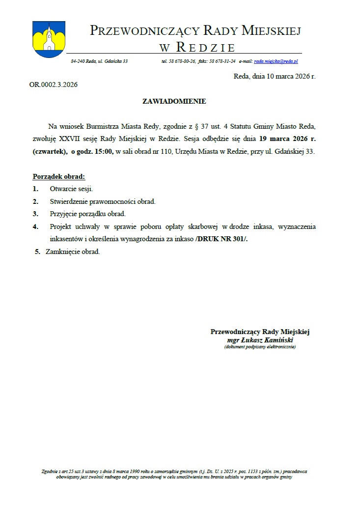 Na podstawie § 37 ust. 4 Statutu Gminy Miasto Reda, na wniosek Burmistrza Miasta Redy, Przewodniczący Rady Miejskiej zwołuje XXVII nadzwyczajną sesję Rady Miejskiej w Redzie. Sesja odbędzie się dnia 19 marca 2026 r. (czwartek), o godz. 15:00 w sali obrad nr 110 Urzędu Miasta w Redzie, przy ul. Gdańskiej 33.